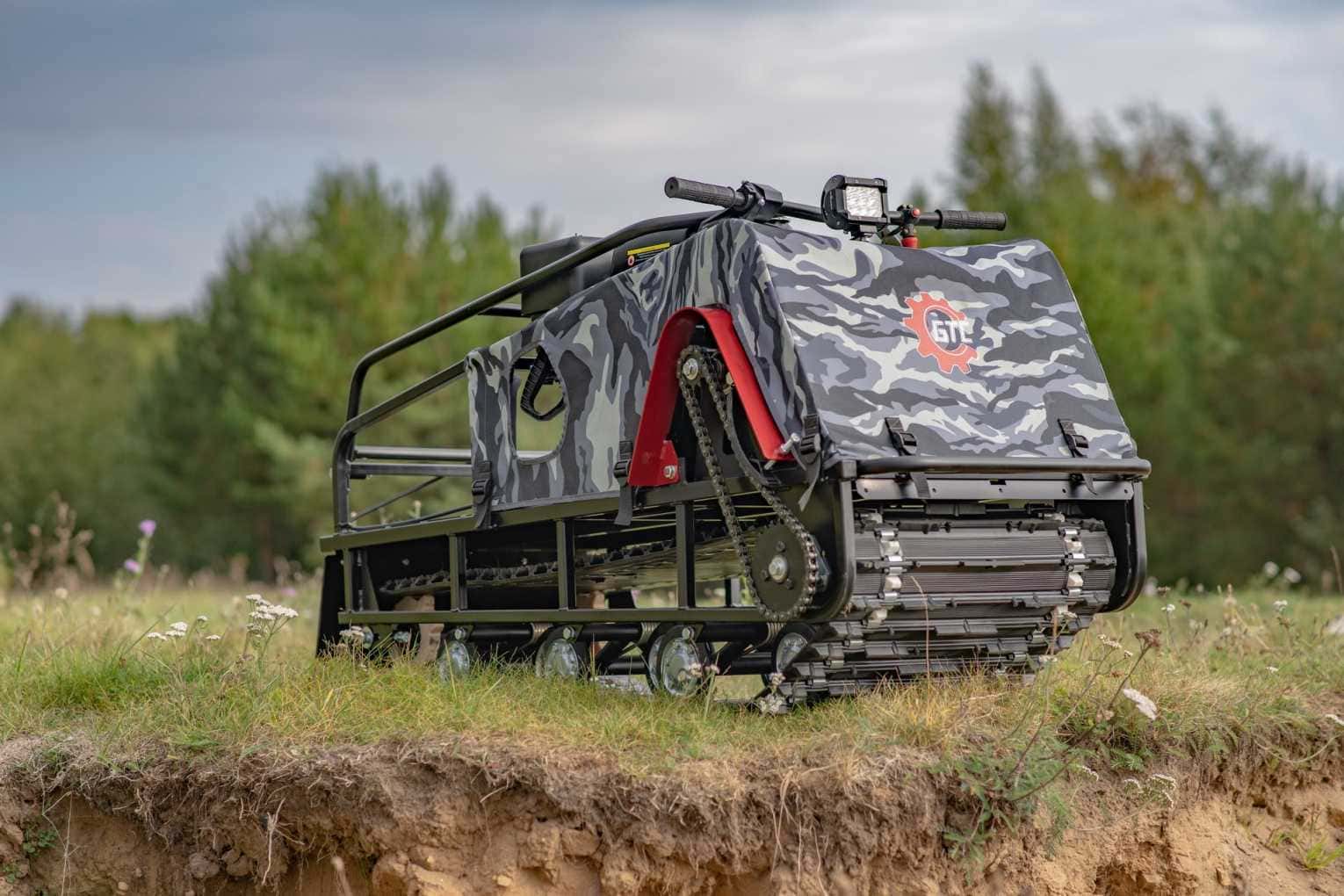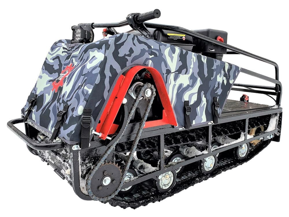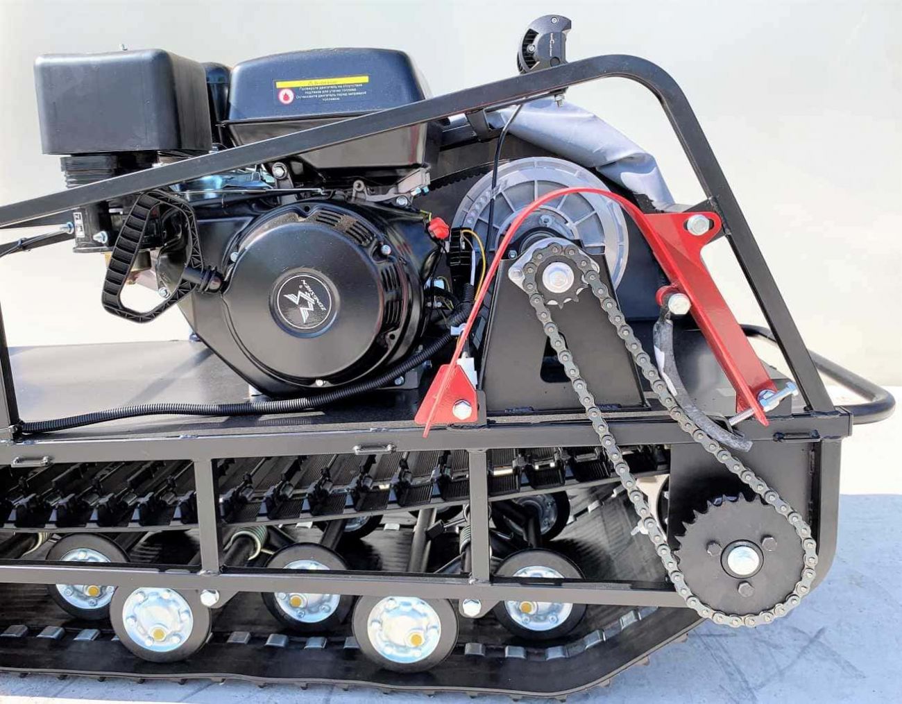 Модель оснащена гусеницей шириной 500 мм. Гусеница в сочетании с катковой подвеской способна проходить спокойно по льду и даже по территории без снега. Мотобуксировщик оснащен надежной цепью типа 520, как на мотоциклах ИЖ, с натяжителем. Кожух цепи оставлен открытым, чтобы избежать скапливания снега под крышкой, что может привести к проблемам.