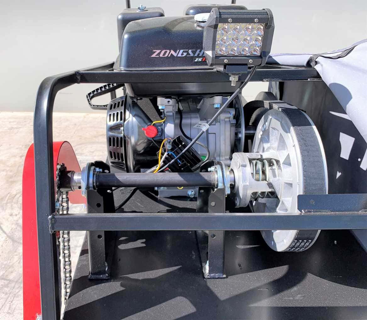 Вариаторная трансмиссия обеспечивает надежность и широкое применение на больших мотобуксировщиках. На мотобуксировщике установлена яркая светодиодная фара мощностью 18 ватт для безопасного передвижения в темное время суток. Также присутствует чека безопасности, которая позволяет немедленно выключить двигатель в случае опасности, предотвращая возможные неприятности, такие как замерзание троса газа.