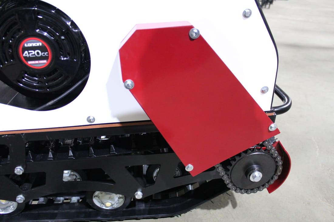 Модель оснащена гусеницей шириной 500 мм. Гусеница в сочетании с катковой подвеской способна проходить спокойно по льду и даже по территории без снега.