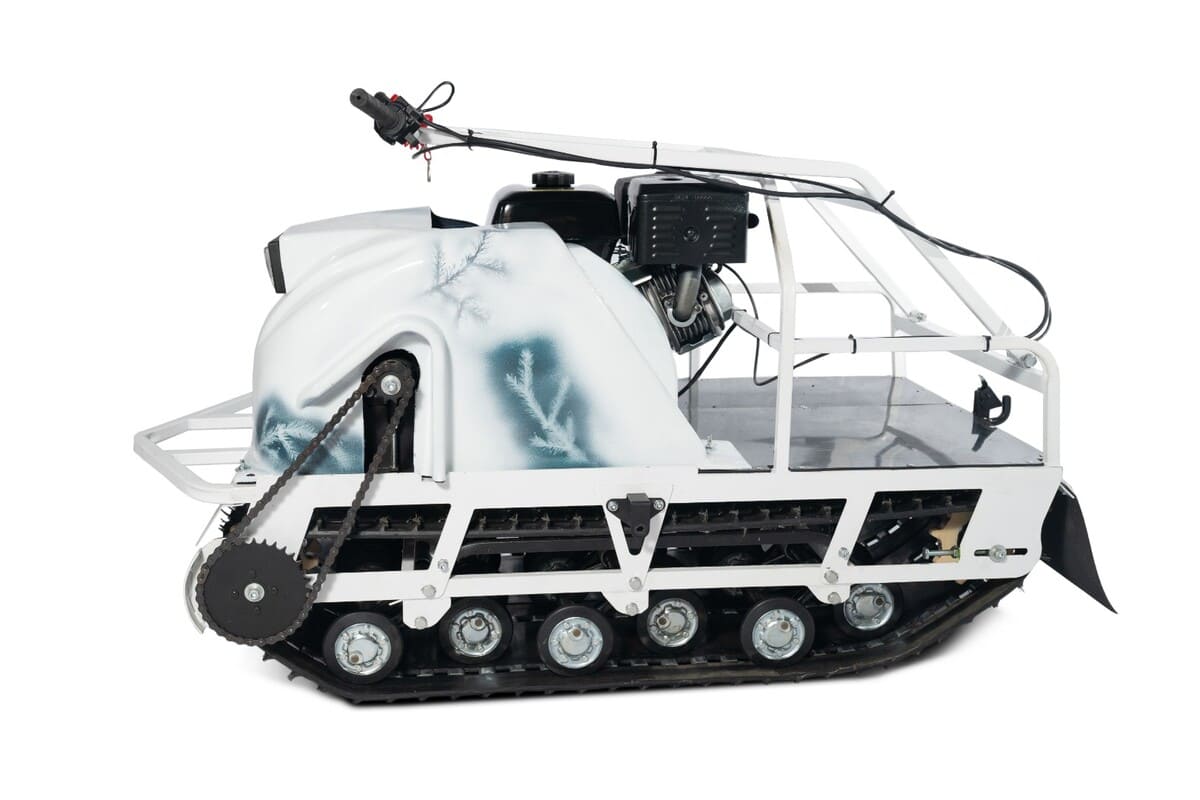 Мотобуксировщик Бурлак-М ПАТРИОТ на катковой подвеске. Две гусеницы шириной 38см каждая обеспечивают высокую проходимость по любым видам покрытий. Данная модель управляется так же, как и любой классический мотобуксировщик, - при помощи складного руля, стоя либо сидя в волокушах или прицепе. Таким образом, нет необходимости ставить данную технику на учет и получать права на управление. На Бурлаке ПАТРИОТ установлены проверенная временем трансмиссия с вариатором Сафари.
