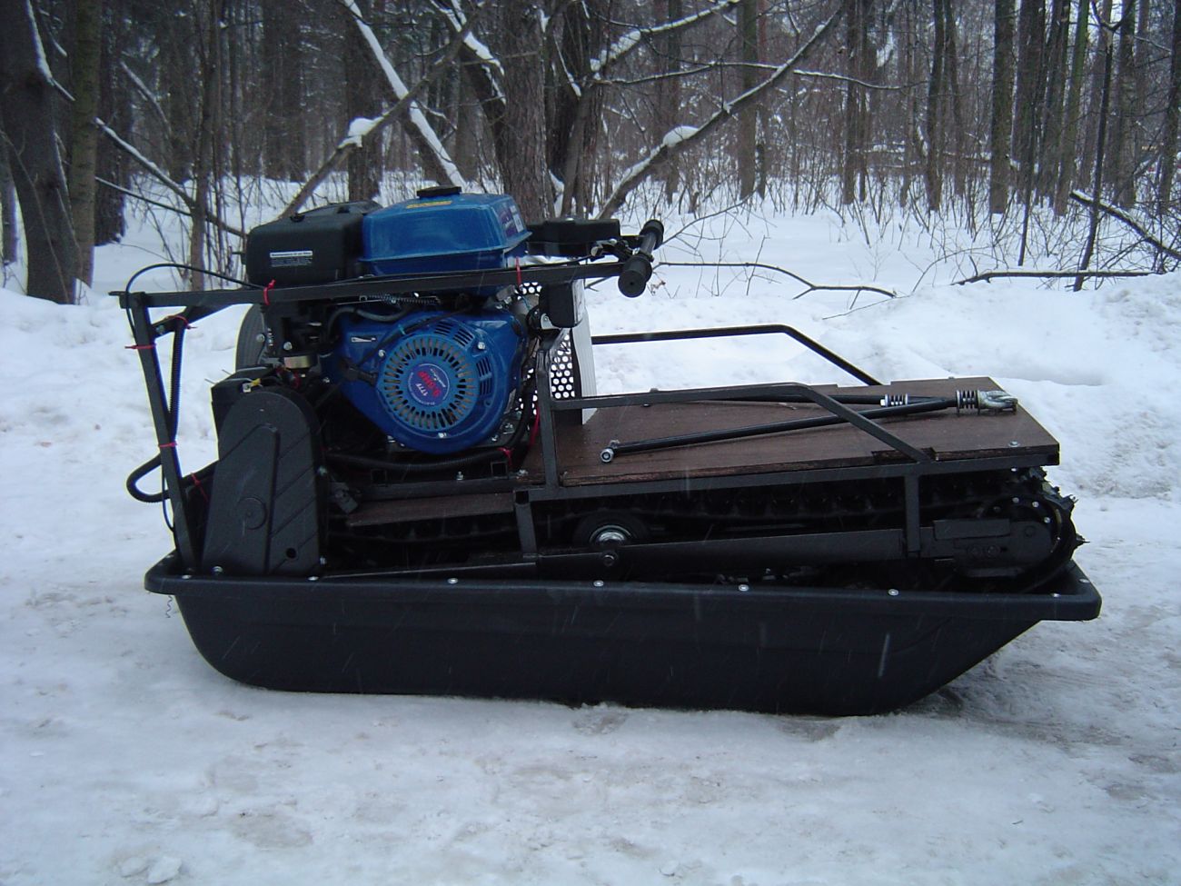 Мотособака весит 95 кг, а размер ее составляет 150 см в длину, 55 см в ширину и 60 см в высоту. Благодаря своей легкости и компактности, мотобуксировщик способен маневрировать и проходить по рыхлой и мягкой почве. К тому же мотобукс оснащен катковой подвеской, которая сглаживает ход, обеспечивает устойчивость на неровной поверхности, смягчает удары и вибрации от дороги.