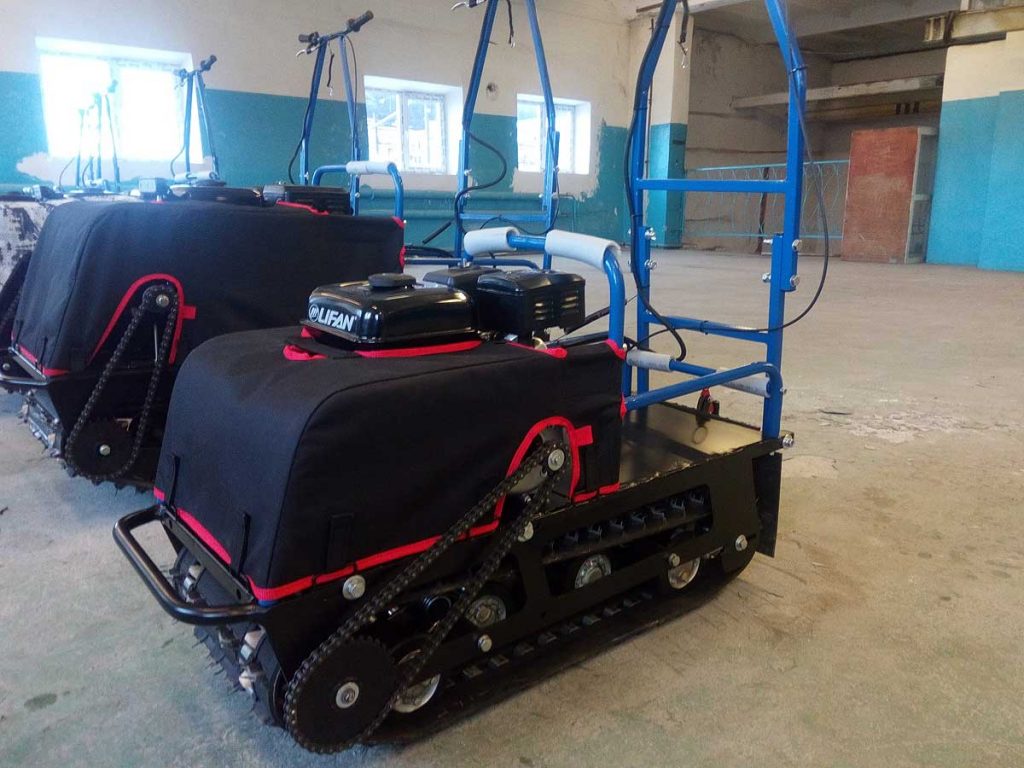 Мотопес отличается простой конструкцией и сборкой - двигатель, вариатор и гусеница, закрепленные на раме. В отличии от снегоходов, они компактнее (помещаются в багажник любого легкового авто), дешевле и маневреннее.