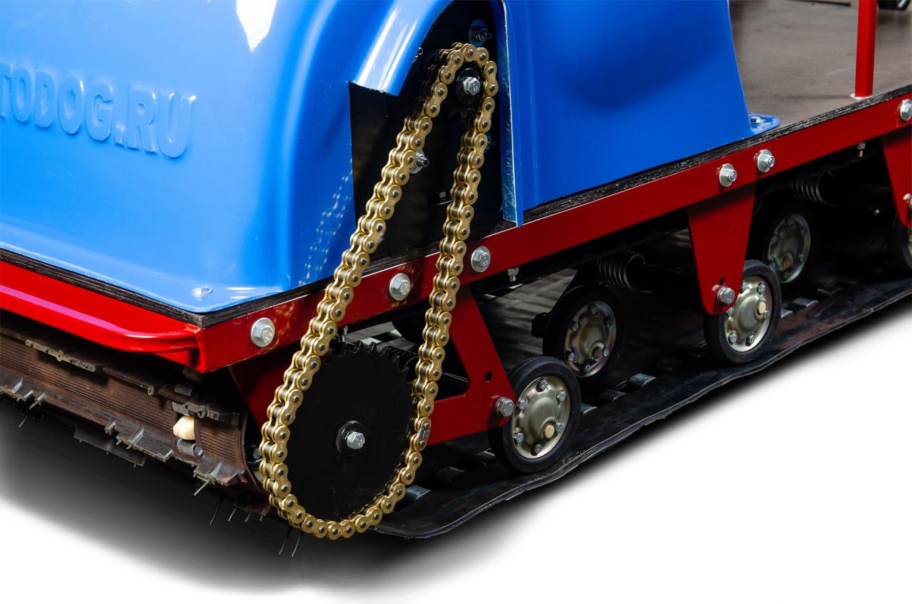 Мотособака весит 100 кг, а размер ее составляет 130 см в длину, 59 см в ширину и 84 см в высоту. Благодаря своей легкости и компактности, мотобуксировщик может маневрировать и проходить по рыхлой и мягкой почве. Кроме того, у мотобукса есть катковая подвеска, которая улучшает ход, обеспечивает устойчивость на неровной поверхности, а также смягчает удары и вибрации от дороги.