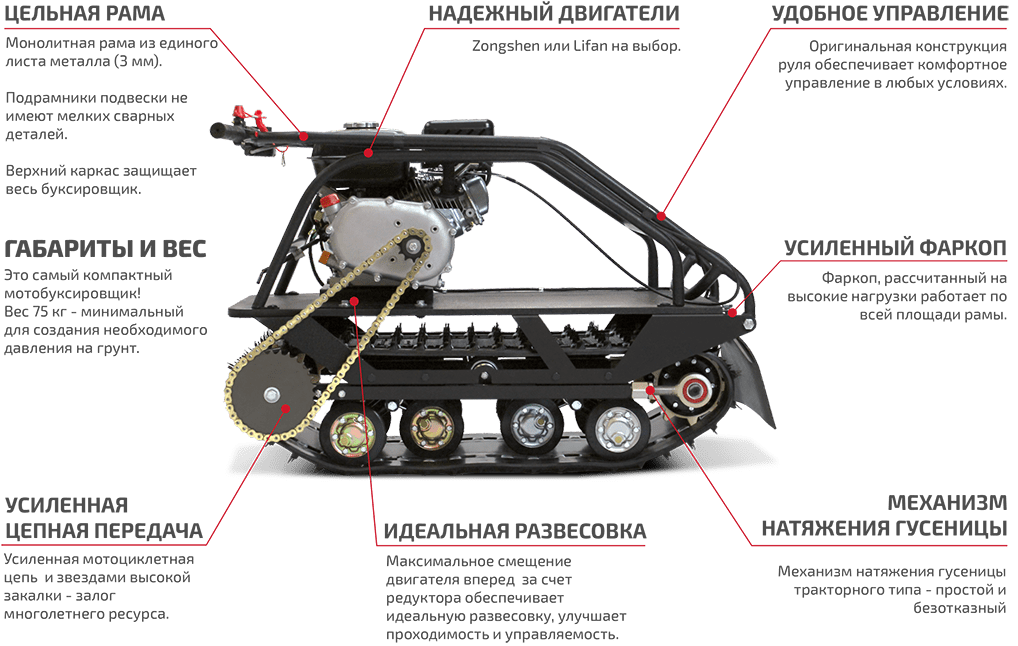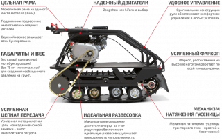 Мотособака оснащена специальной гусеницей Composit, которая обеспечивает отличное сцепление со снегом и со льдом благодаря своим техническим качествам, а также тракторным механизмом натяжения цепи.