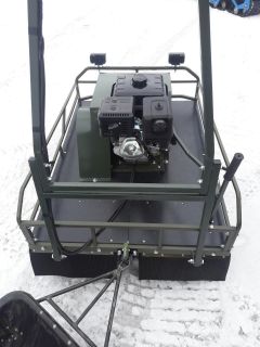 Этот мотобукс оснащен 4-х тактным двигателем мощностью 13 л. с., что позволяет достигать скорости до 30 км/ч. Это позволяет быстро перевозить груз весом до 250 кг. Объем двигателя составляет 420 кубов. Кроме того, мотовездеход оснащен топливным баком на 5,6 литров. Расходуя до 3 литров бензина в час, мотобуксировщик дает возможность до 2х часов беспрерывной работы.