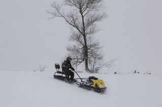 В конструкции мотовездехода используется цельная резиновая гусеница шириной 500 мм. Гусеница в сочетании с катковой подвеской способна проходить спокойно по льду и даже по территории без снега.