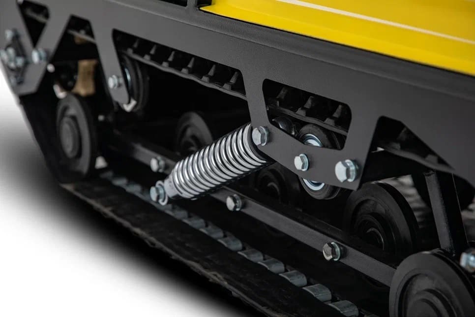 Подвеска мотобуксировщика Шармакс выполнена с боковыми амортизаторами. Такой тип подвески обеспечивает более высокую износостойкость и надежность всей конструкции, а также улучшает общую устойчивость мотобуксировщика от переворачиваний и заваливания на скорости.