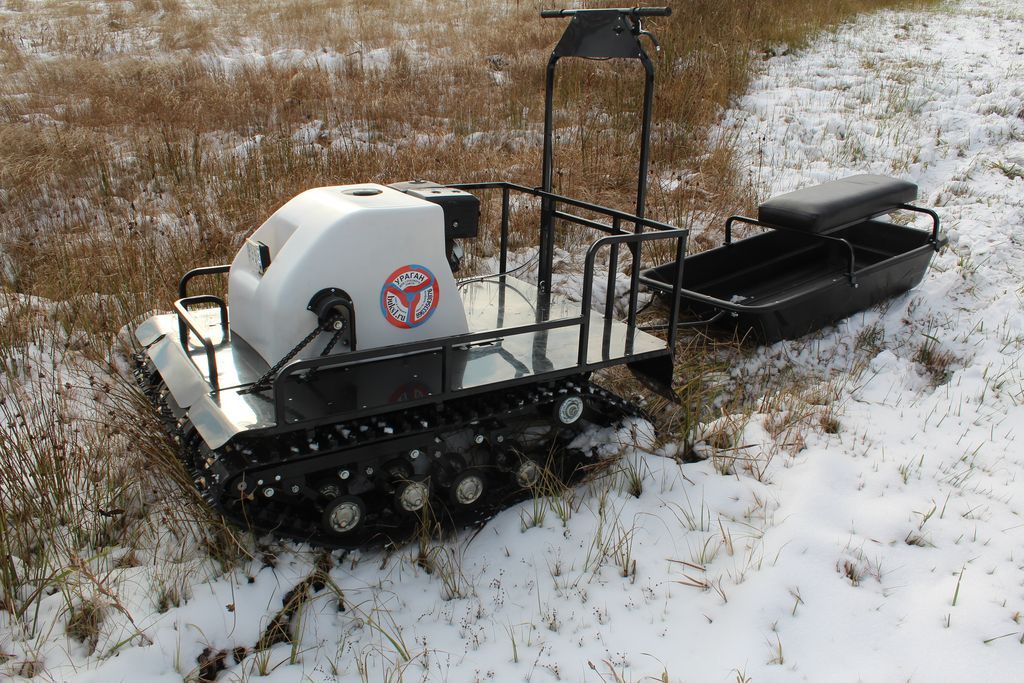 Буксировщик производится с компактной задней площадкой для перевозки личных вещей, инструментов, рыбацких снастей и прочих необходимых мелочей охотнику или рыбаку. Техника оснащена яркой фарой, которая позволяет пользоваться транспортом даже в темное время суток. Морозо- и вибростойкий капот с чехлом карбюратора и пластинами утепления - максимально защищает ДВС от обледенения и от возможности лопнуть.