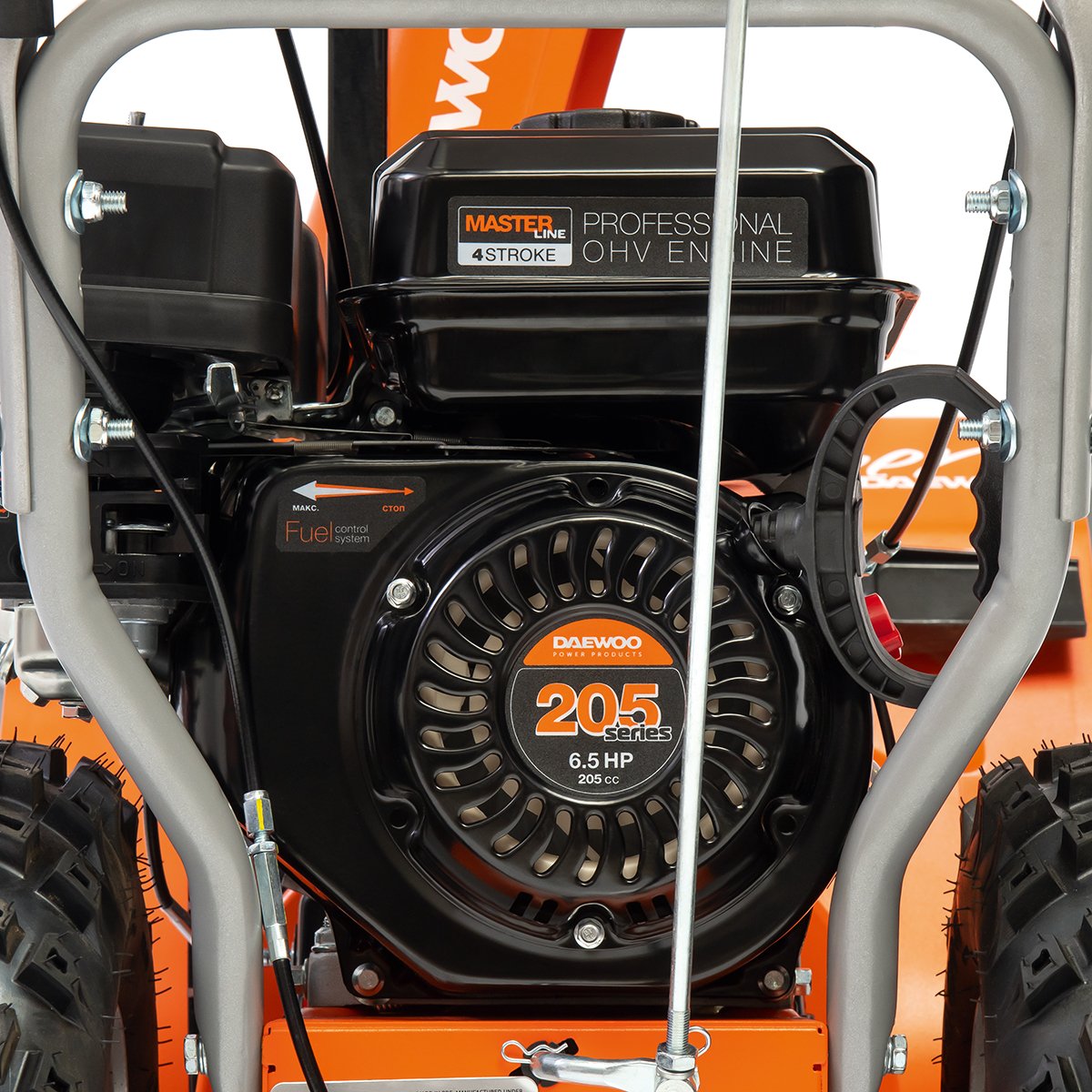 - Ручной стартер. Используется для запуска двигателя и находится в удобном и доступном месте на задней части снегоуборщика в виде рычага.