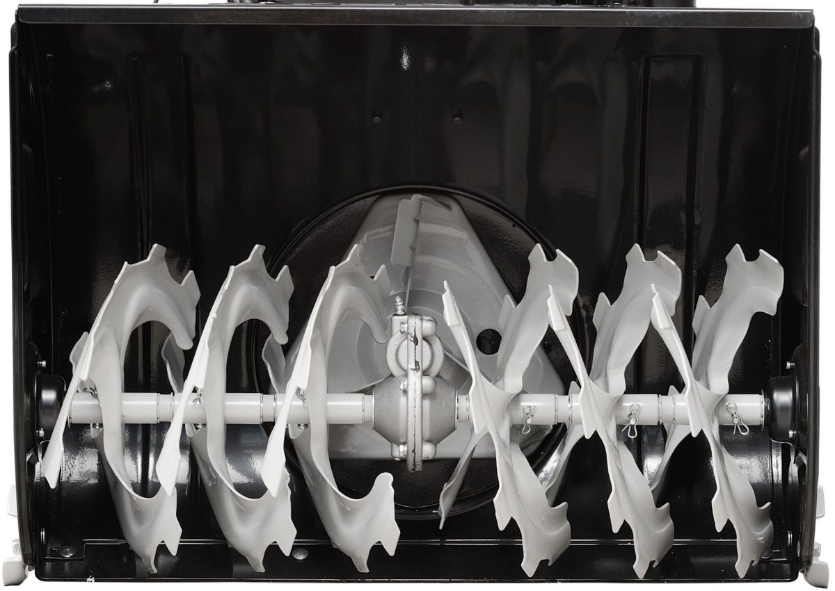 Эта модель снегоуборочной техники демонстрирует эффективность при работе с плотным и свежим снегом. Она также оснащена специальными рычагами на панели управления, которые позволяют регулировать высоту и направление выброса снега. Основные преимущества модели: