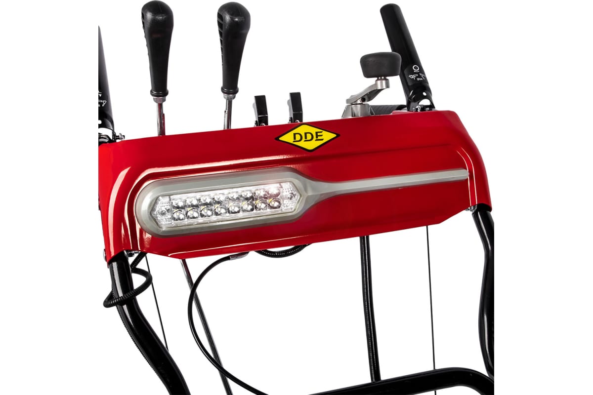 Самоходный снегоуборщик DDE ST9070LE предназначен для очистки от снега придомовой территории, садовых и подъездных дорожек, парковочных мест и других небольших территорий. Имеет литые резиновые колеса, фару и электростартер. Кроме того, снегоуборщик отличается наличием 8 передач — 6 вперед и 2 назад, поэтому вы запросто сможете подобрать для себя оптимальный режим работы.