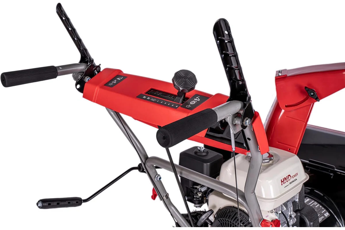 Японский бензиновый 4-х тактный двигатель Honda GP 200 (5,5 л.с.) отличается уверенной работой,высокой производительностью и долгим сроком службы. 6 передних и 2 задние скорости обеспечивают максимальную маневренность. Чтобы защитить ковш и очищаемое покрытие от повреждений, ковш регулируется по высоте. Управление переключением скоростей удобно расположено на панели перед оператором.