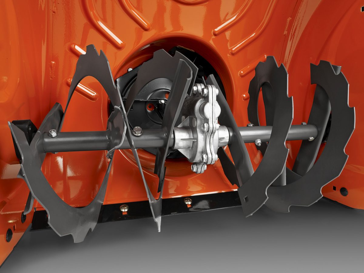 - Двухступенчатая система. Снег подается под кожух шнеком и затем выбрасывается крыльчаткой через раструб снегоотбрасывателя Husqvarna ST230P 9619100-90.