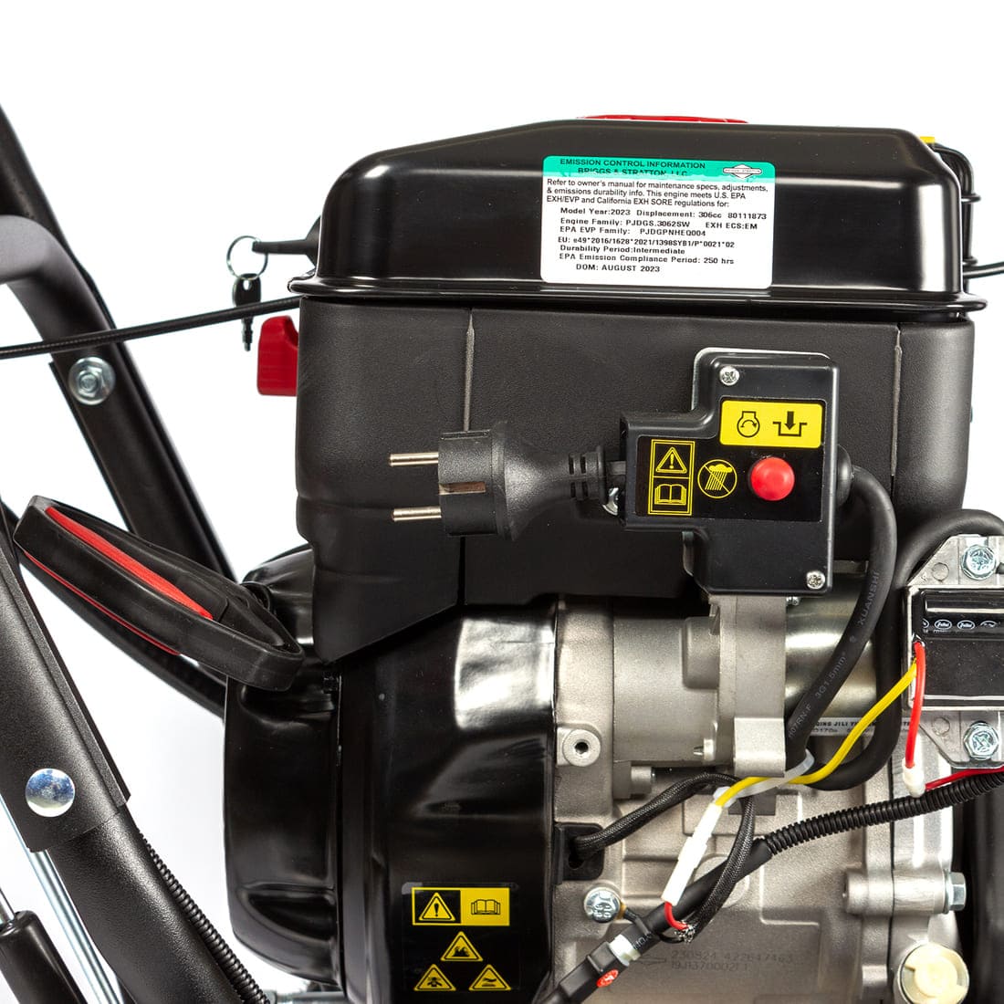 - ? запуск: снегоуборщик оснащен ручным стартером и электростартером;